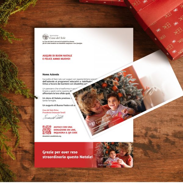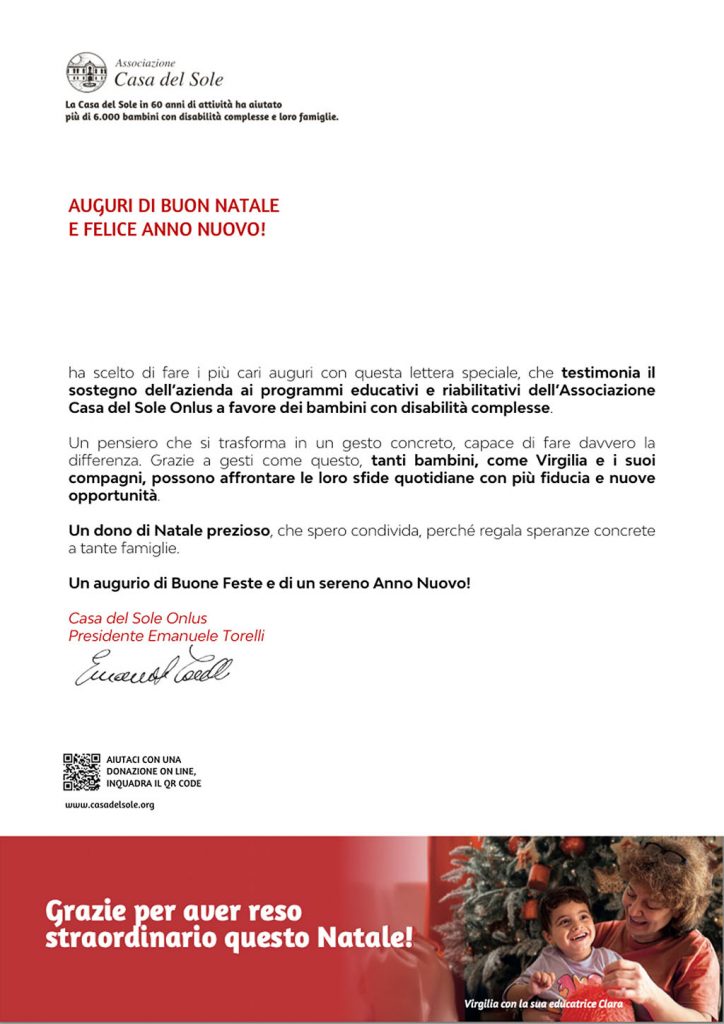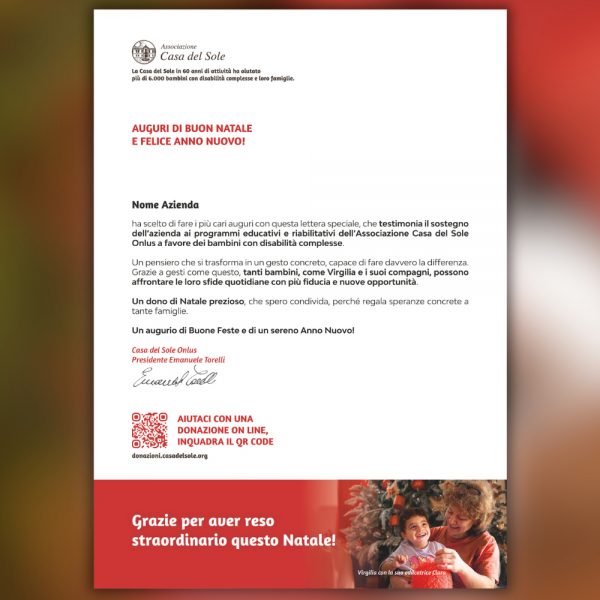 La lettera di auguri natalizi di Casa del Sole racchiude un grande valore solidale e simbolico: attraverso la lettera firmata dal nostro Presidente, potrai raccontare a dipendenti, clienti e fornitori l’impegno della tua azienda a sostegno delle attività educative e riabilitative a favore di bambini con disabilità complesse, in occasione del Natale.